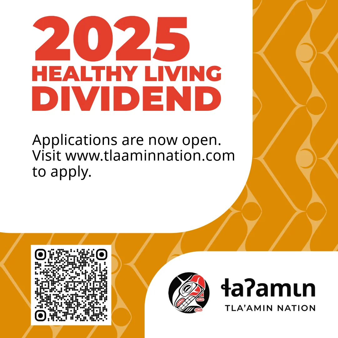 Every registered Tla’amin adult and child is eligible to receive a $500 direct payment to support your own wellness goals—whether that’s helping with sports and recreation costs, travel to tournaments, cultural activities, or simply easing the cost of daily life. We know wellness looks different for every household, and this dividend is one way we support your wellness on your terms.