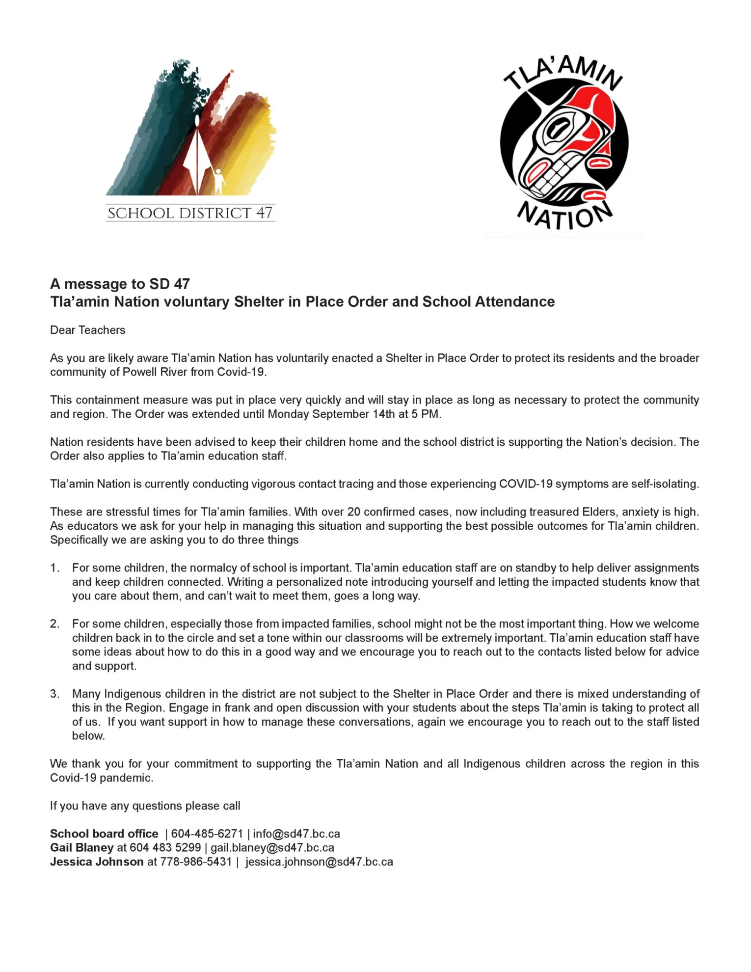 3. Many Indigenous children in the district are not subject to the Shelter in Place Order and there is mixed understanding of this in the Region. Engage in frank and open discussion with your students about the steps Tla’amin is taking to protect all of us. If you want support in how to manage these conversations, again we encourage you to reach out to the staff listed below.