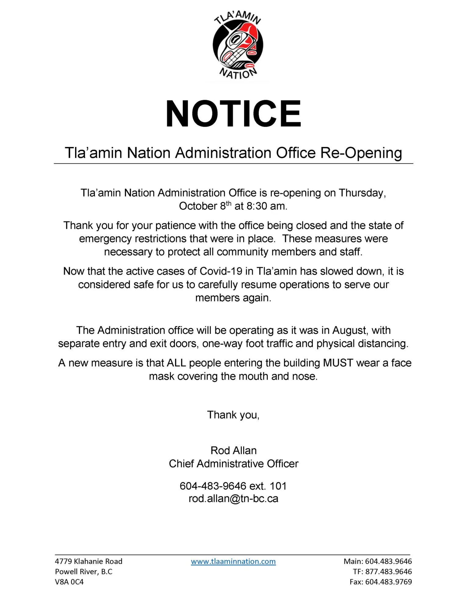 Tla’amin Nation Administration Office is re-opening on Thursday, October 8th at 8:30 am.