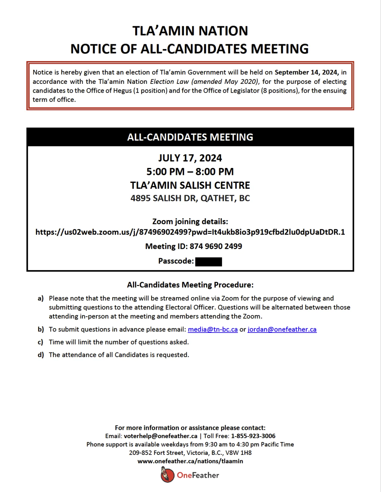The Tla’amin Nation General Election is September 14, 2024. One Feather is the Electoral Officer and will be hosting an All Candidates meeting on July 17th, 2024 from 5PM to 8PM at the Tla’amin Salish Centre and on Zoom.
