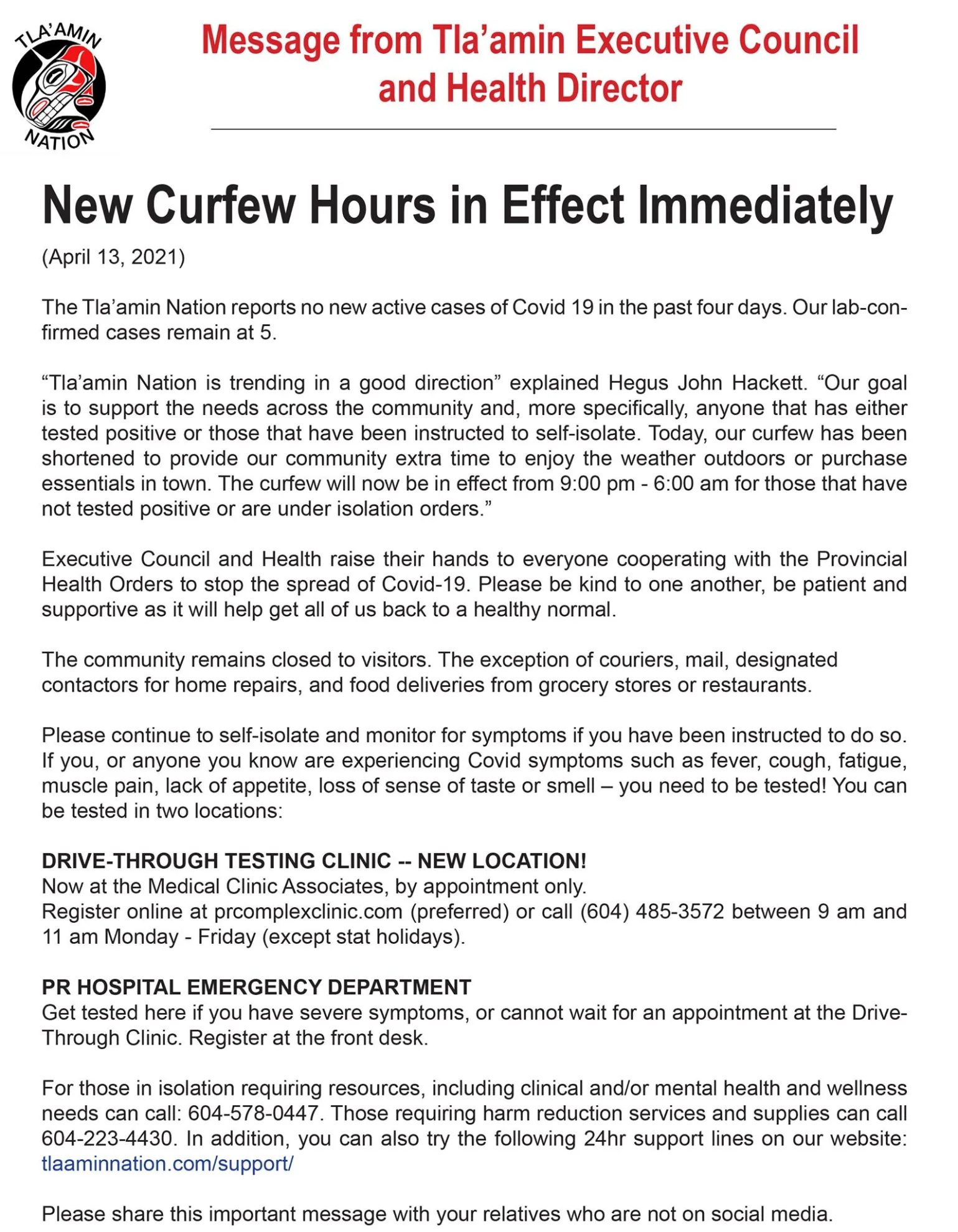 “Tla’amin Nation is trending in a good direction” explained Hegus John Hackett. “Our goal is to support the needs across the community and, more specifically, anyone that has either tested positive or those that have been instructed to self-isolate. Today, our curfew has been shortened to provide our community extra time to enjoy the weather outdoors or purchase essentials in town. The curfew will now be in effect from 9:00 pm – 6:00 am for those that have not tested positive or are under isolation orders.”