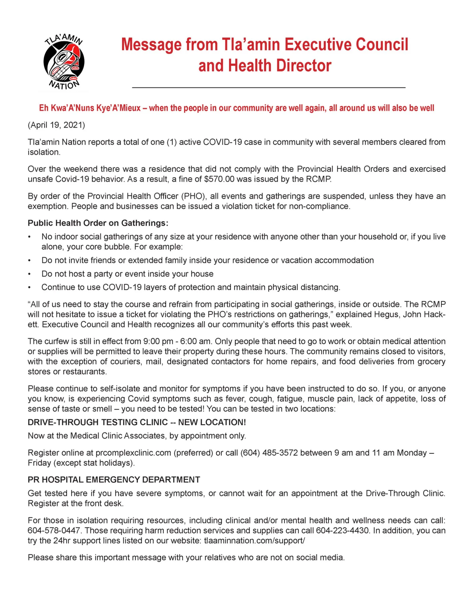 Tla’amin Nation reports a total of one (1) active COVID-19 case in community with several members cleared from isolation.