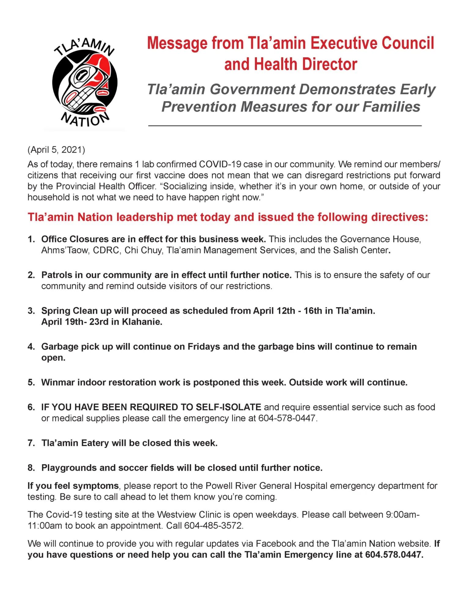 We will continue to provide you with regular updates via Facebook and the Tla’amin Nation website. If you have questions or need help you can call the Tla’amin Emergency line at 604.578.0447