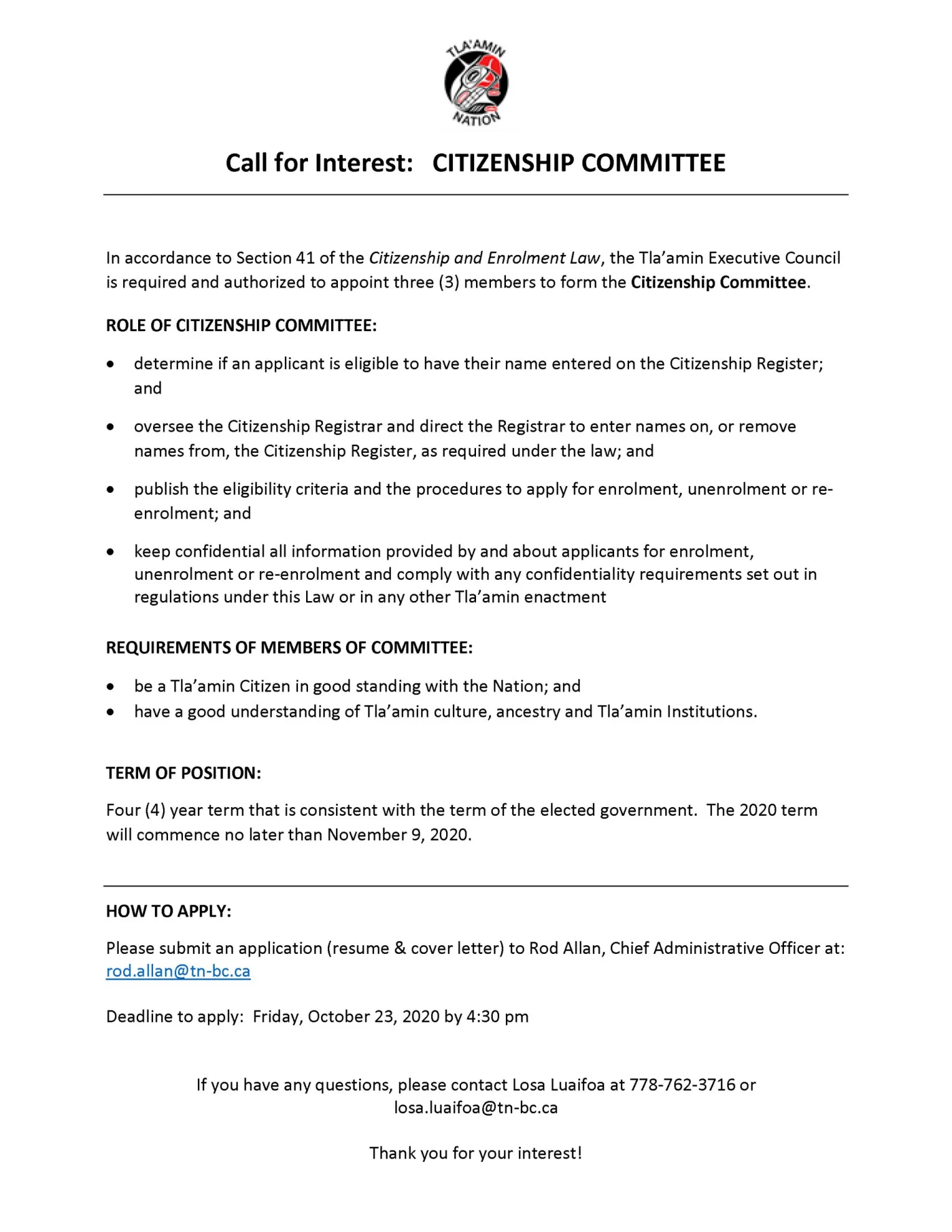 In accordance to Section 41 of the Citizenship and Enrolment Law, the Tla’amin Executive Council is required and authorized to appoint three (3) members to form the Citizenship Committee.