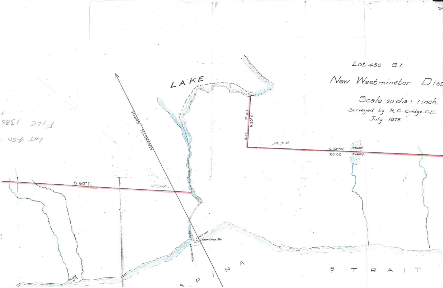 According to the Province’s own laws, Indian settlements could not be pre-empted. However, the shape of the Tišosem village (old IR#1) that borders lot 450 reveals that it was the border of Lot 450 that defined Tla’amin reserve land which means that the lot shaped the reserve, not the other way around.