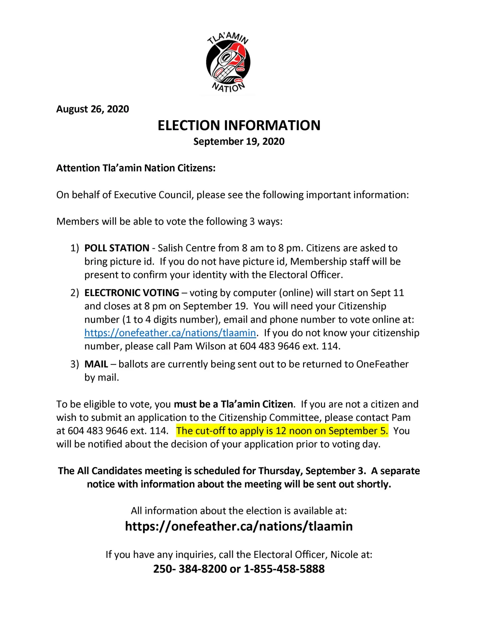 2) ELECTRONIC VOTING – voting by computer (online) will start on Sept 11 and closes at 8 pm on September 19. You will need your Citizenship number (1 to 4 digits number), email and phone number to vote online at: https://onefeather.ca/nations/tlaamin. If you do not know your citizenship number, please call Pam Wilson at 604 483 9646 ext. 114.