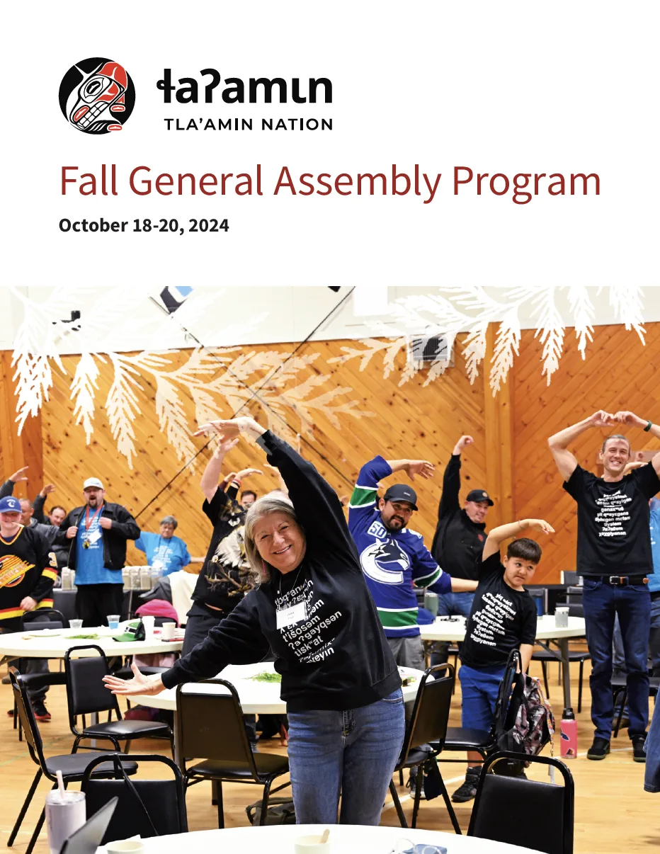 Tla’amin Nation’s Fall General Assembly runs October 18-20 2024 and will include business and reporting, cultural activities, and a Baby Welcoming Ceremony . Registration for the assembly closed on October 11th with a record 228 registrants including over 60 urban members.