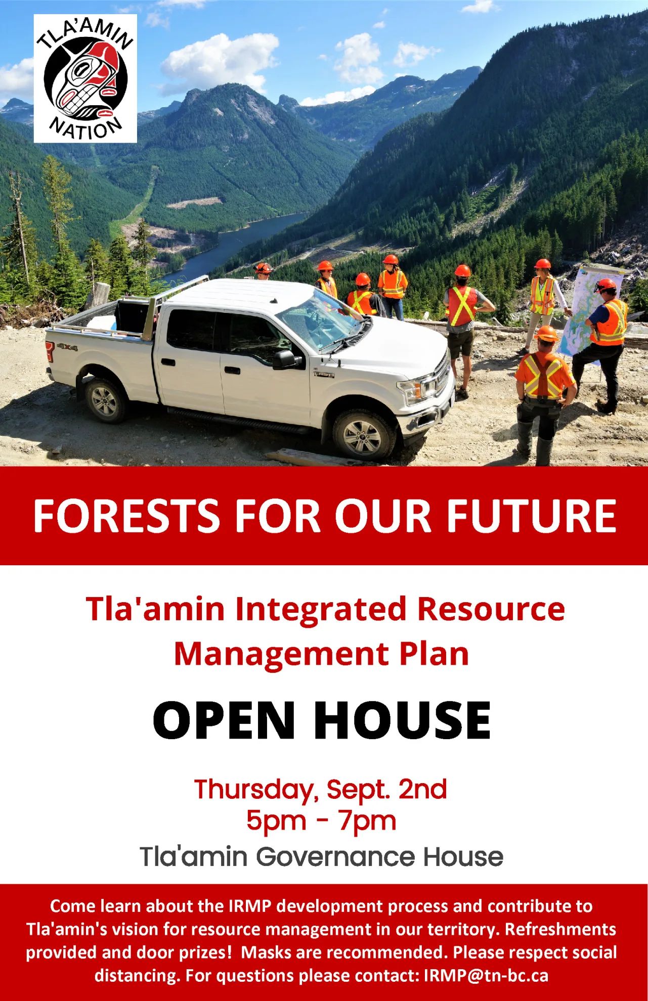 Come learn about the IRMP development process and contribute to Tla’amin’s vision for resource management in our territory. Refreshments provided and door prizes! Masks are recommended. Please respect social distancing. For questions please contact: IRMP@tn-bc.ca