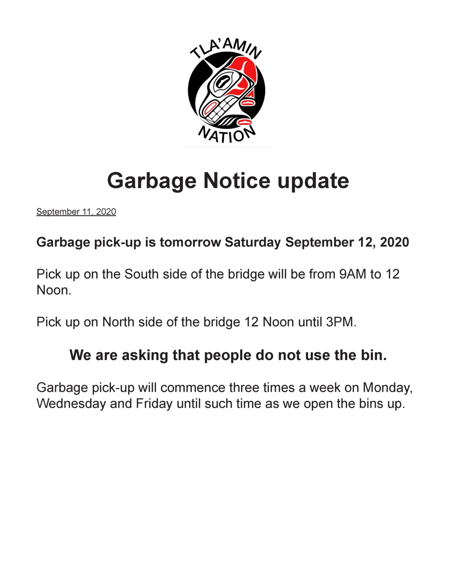 Garbage pick-up is tomorrow Saturday September 12, 2020