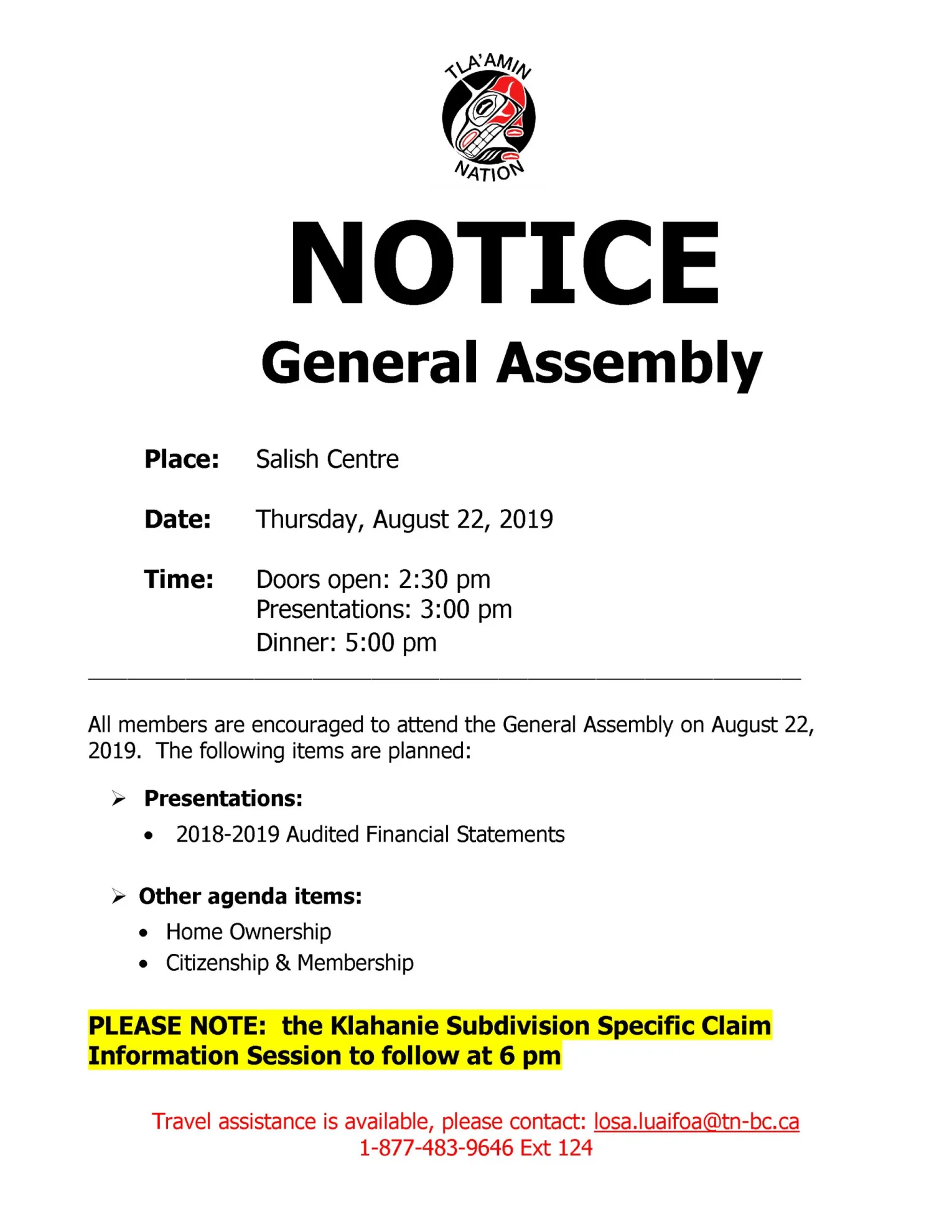 All members are encouraged to attend the General Assembly on August 22, 2019. The following items are planned: