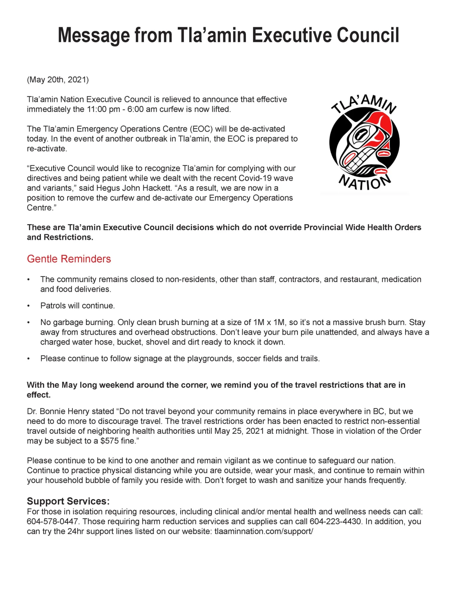 Tla’amin Nation Executive Council is relieved to announce that effective immediately the 11:00 pm – 6:00 am curfew is now lifted.