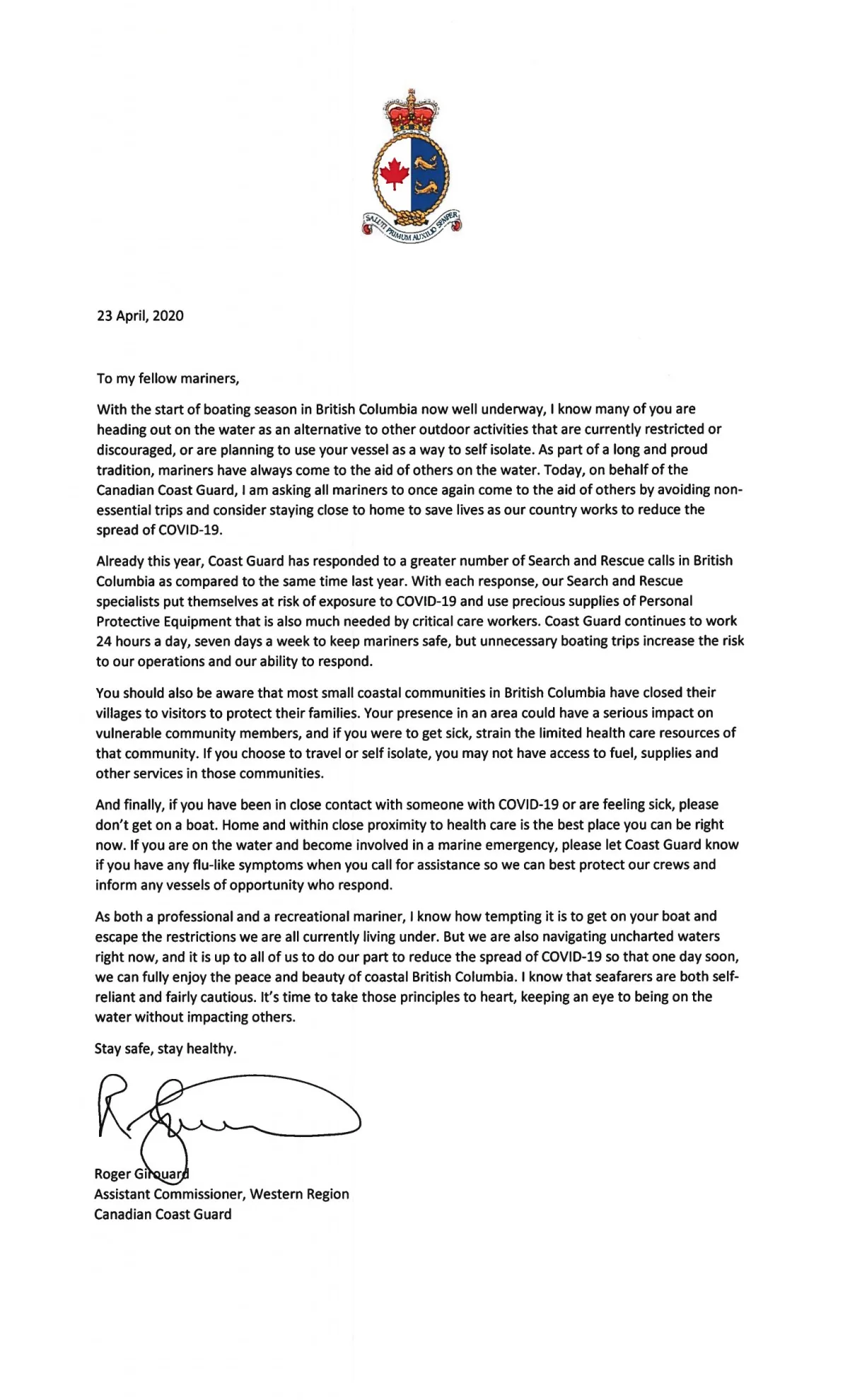 With the boating season now well underway in British Columbia, I know many of you are heading out on the water as an alternative to other outdoor activities that are currently restricted or discouraged, or are planning to use your vessel as a way to self isolate. As part of a long and proud tradition, mariners have always come to the aid of others on the water. Today, on behalf of the Canadian Coast Guard, I am asking all mariners to once again come to the aid of others by avoiding nonessential trips and consider staying close to home to save lives as our country works to reduce the spread of COVID-19.
