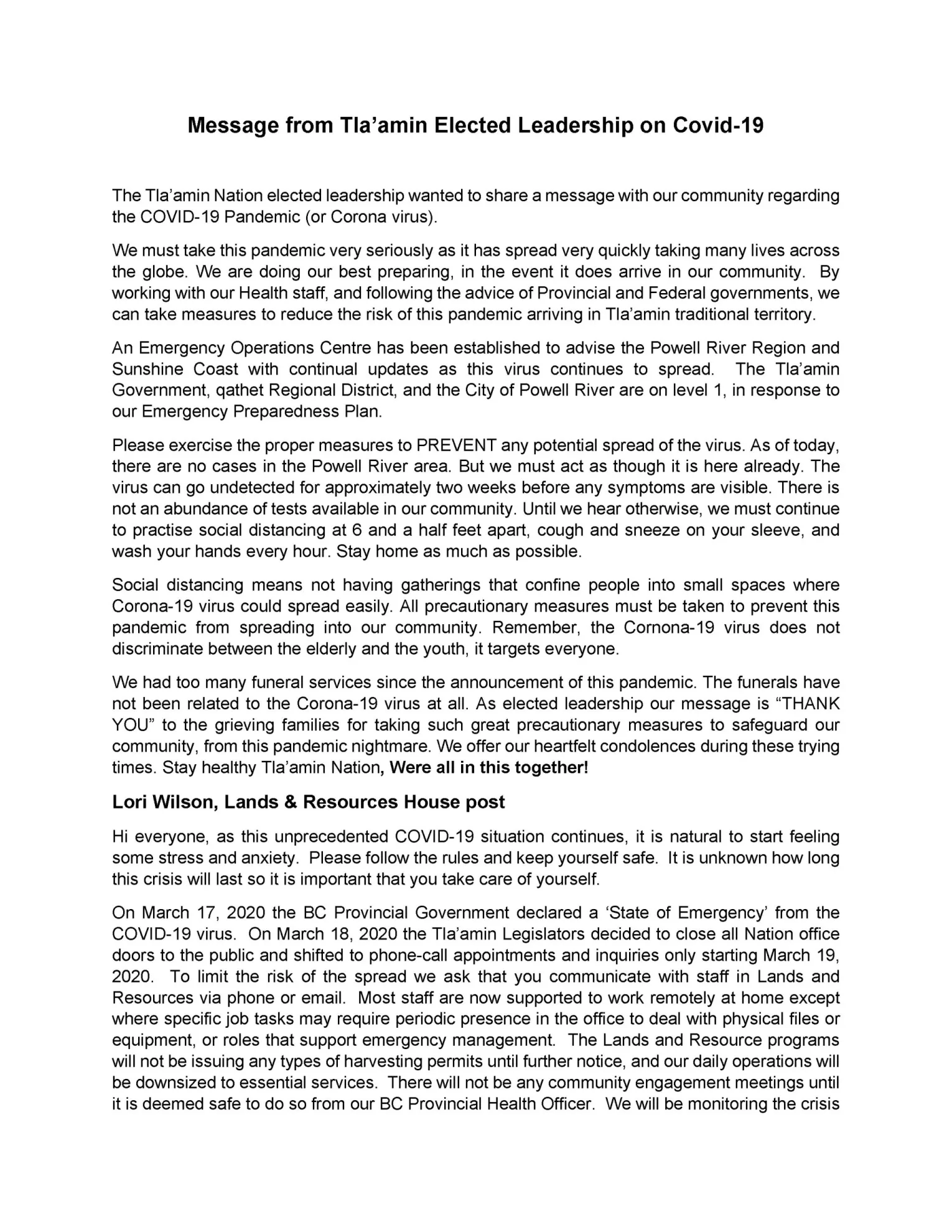 The Tla’amin Nation elected leadership wanted to share a message with our community regarding the COVID-19 Pandemic (or Corona virus).
