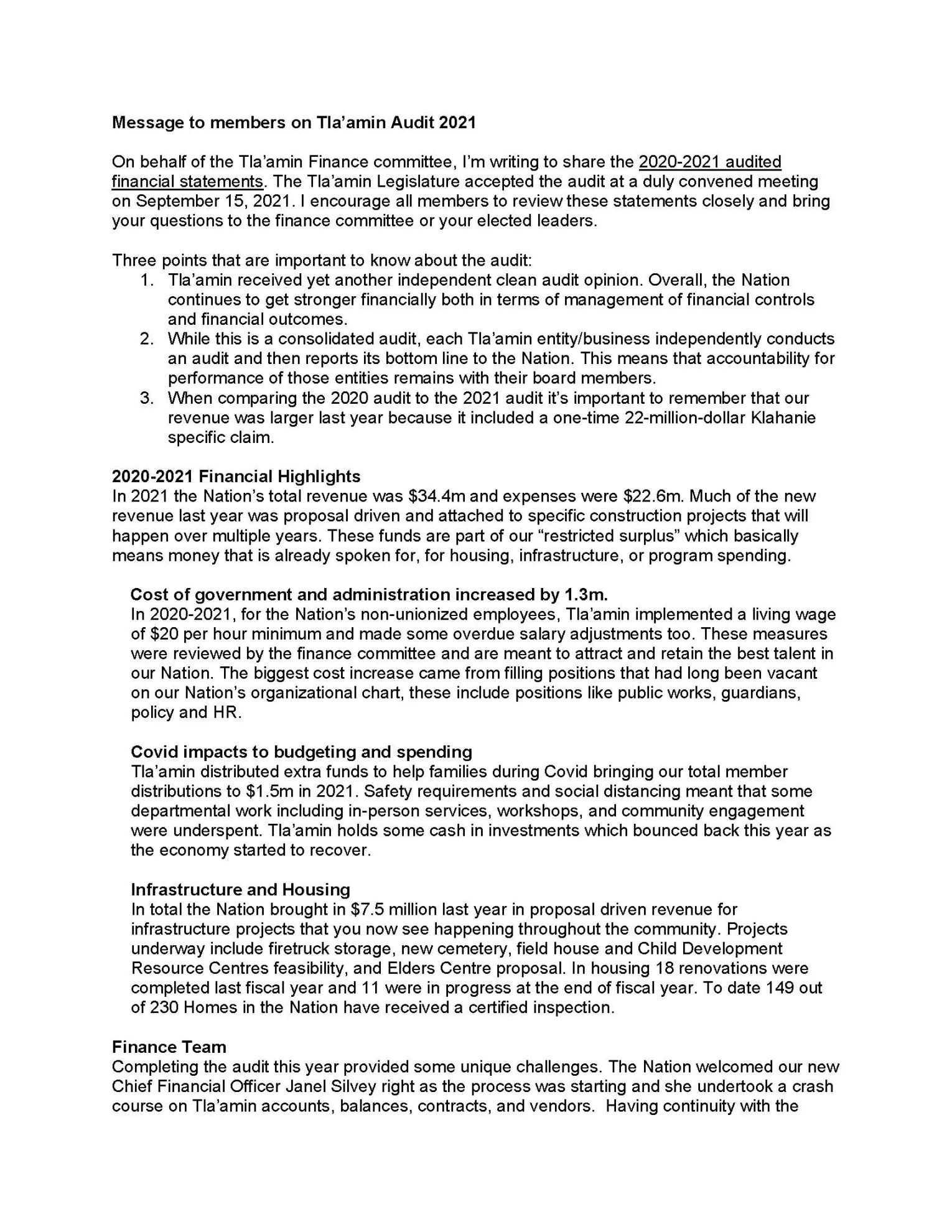 On behalf of the Tla’amin Finance committee, I’m writing to share the 2020-2021 audited financial statements. The Tla’amin Legislature accepted the audit at a duly convened meeting on September 15, 2021. I encourage all members to review these statements closely and bring your questions to the finance committee or your elected leaders.