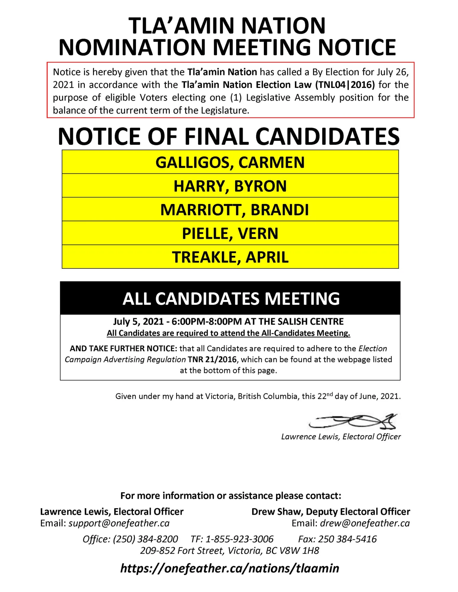 NOMINATION MEETING NOTICE: Notice is hereby given that the Tla’amin Nation has called a By Election for July 26, 2021 in accordance with the Tla’amin Nation Election Law (TNL04|2016) for the purpose of eligible Voters electing one (1) Legislative Assembly position for the balance of the current term of the Legislature.