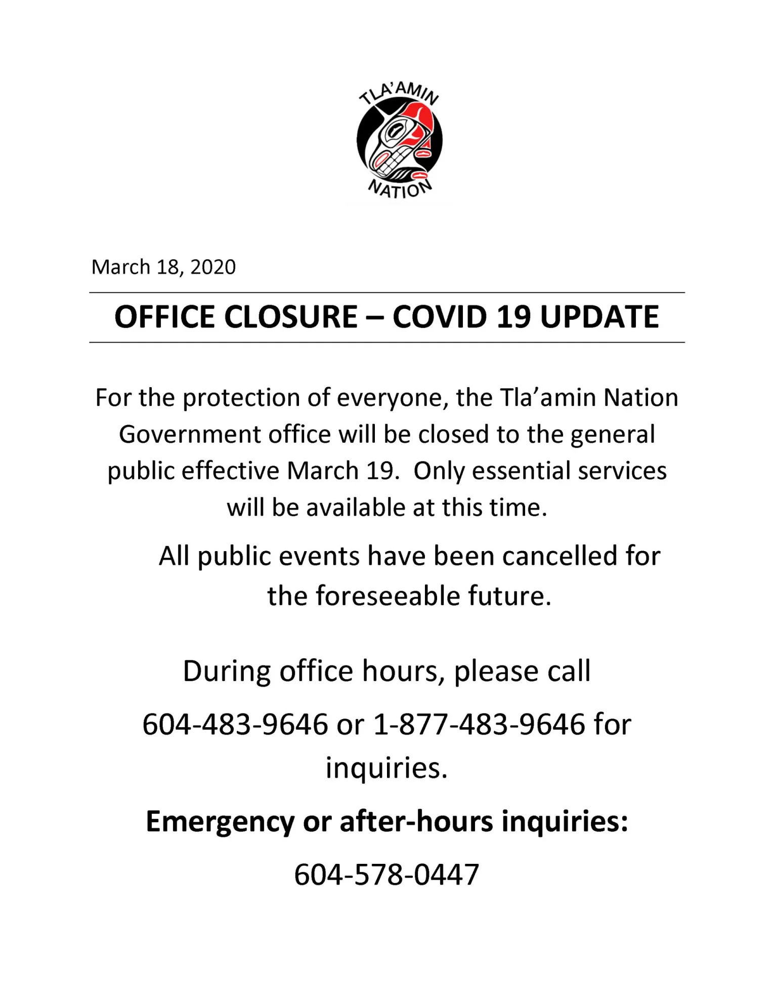 For the protection of everyone, the Tla’amin Nation Government office will be closed to the general public effective March 19. Only essential services will be available at this time.