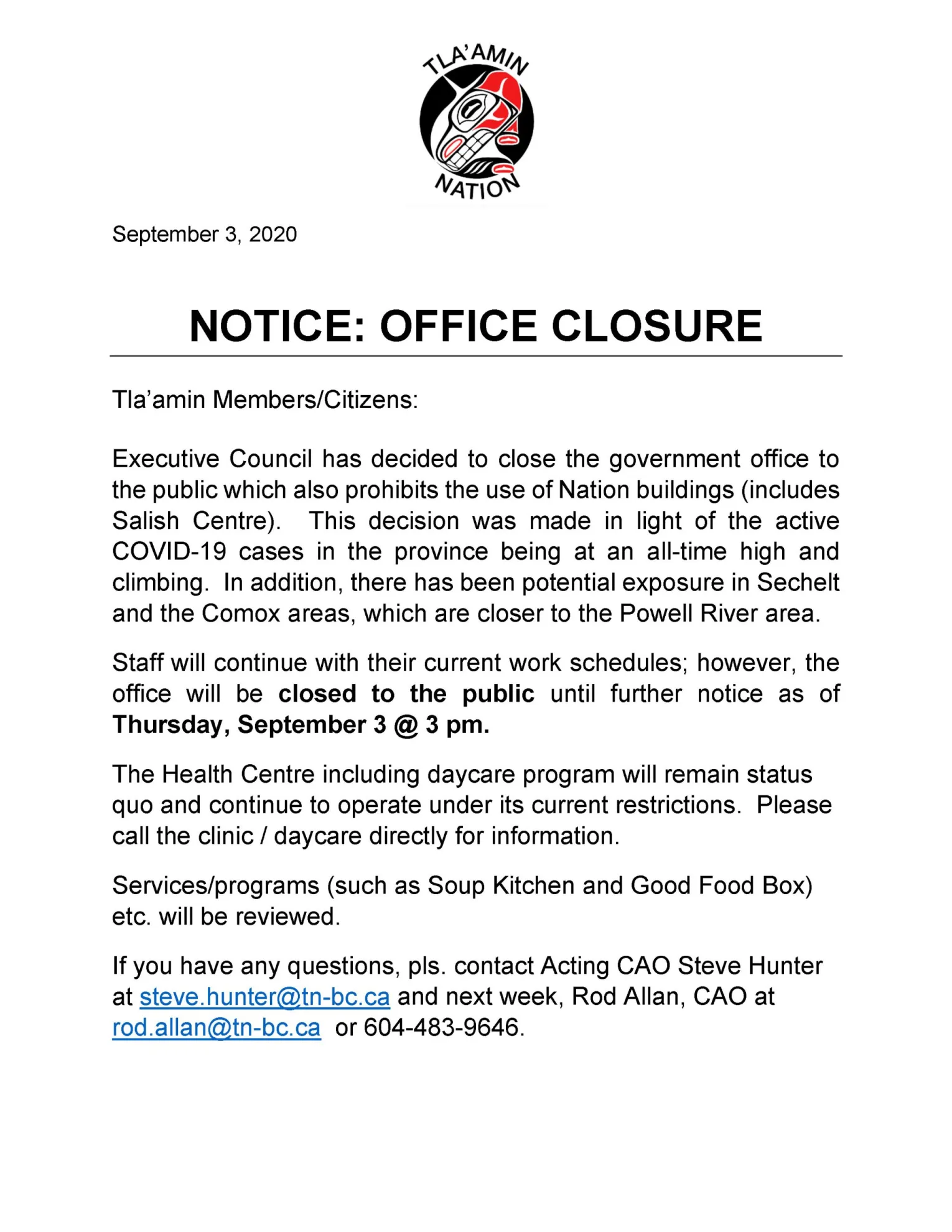 Executive Council has decided to close the government office to the public which also prohibits the use of Nation buildings (includes Salish Centre). This decision was made in light of the active COVID-19 cases in the province being at an all-time high and climbing. In addition, there has been potential exposure in Sechelt and the Comox areas, which are closer to the Powell River area.