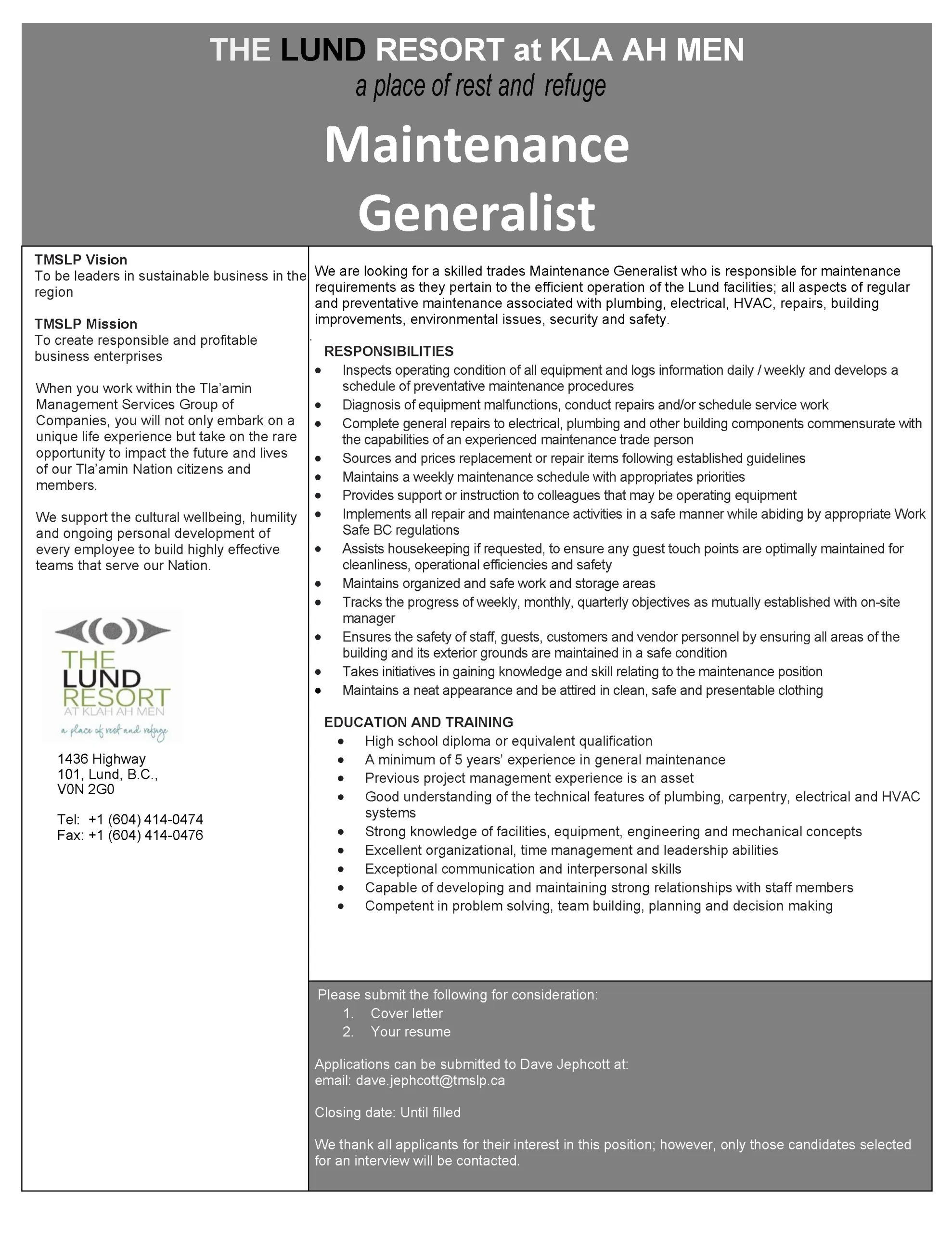 Applications can be submitted to Dave Jephcott by email at: dave.jephcott@tmslp.ca