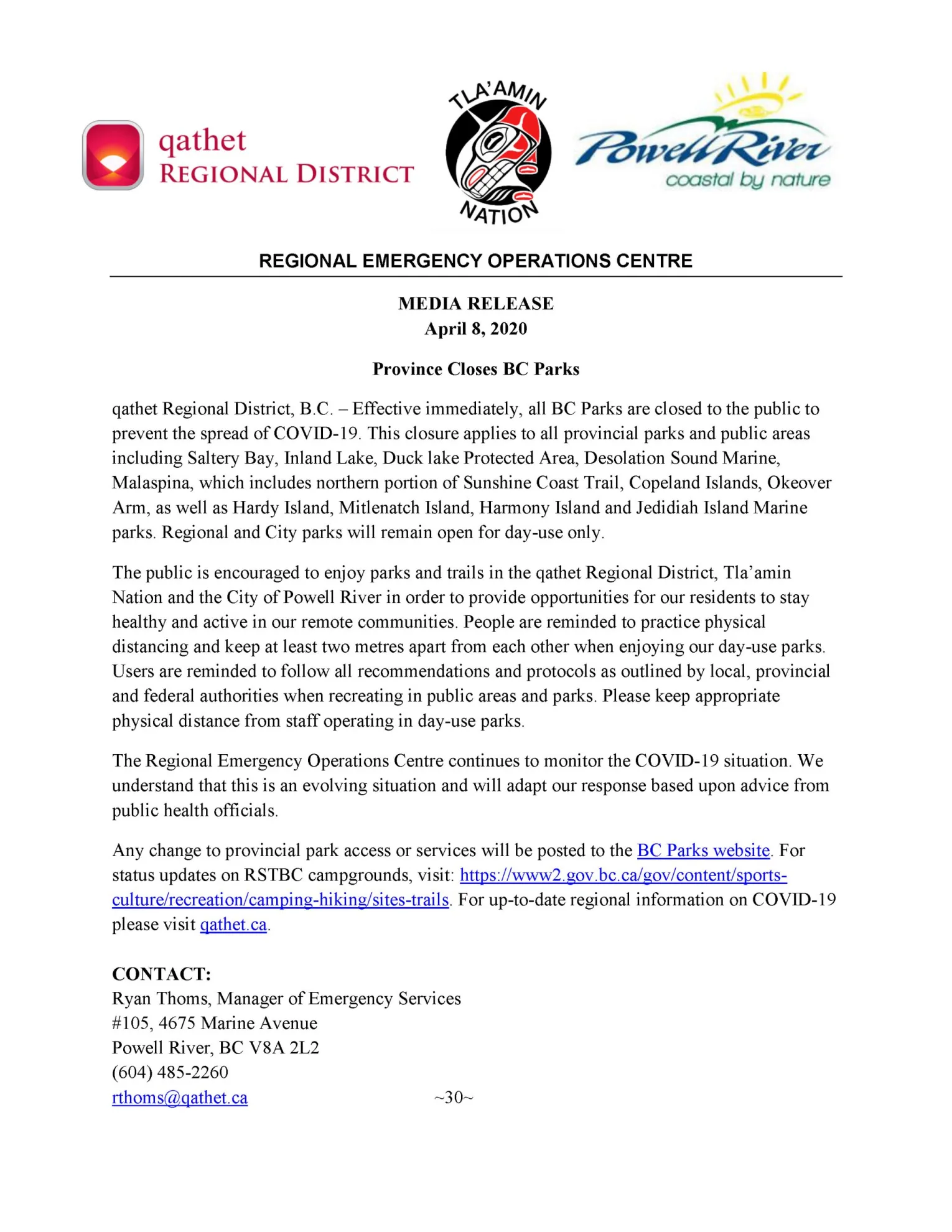qathet Regional District, B.C. – Effective immediately, all BC Parks are closed to the public to prevent the spread of COVID-19. This closure applies to all provincial parks and public areas including Saltery Bay, Inland Lake, Duck lake Protected Area, Desolation Sound Marine, Malaspina, which includes northern portion of Sunshine Coast Trail, Copeland Islands, Okeover Arm, as well as Hardy Island, Mitlenatch Island, Harmony Island and Jedidiah Island Marine parks. Regional and City parks will remain open for day-use only.