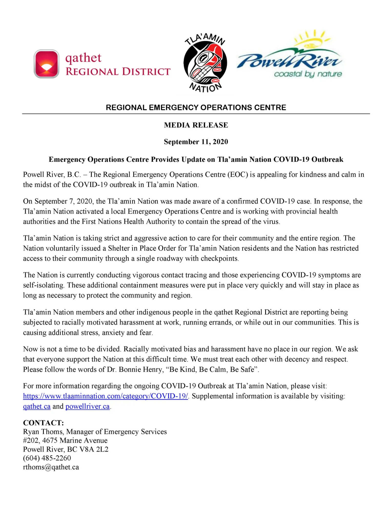 Powell River, B.C. – The Regional Emergency Operations Centre (EOC) is appealing for kindness and calm in the midst of the COVID-19 outbreak in Tla’amin Nation.