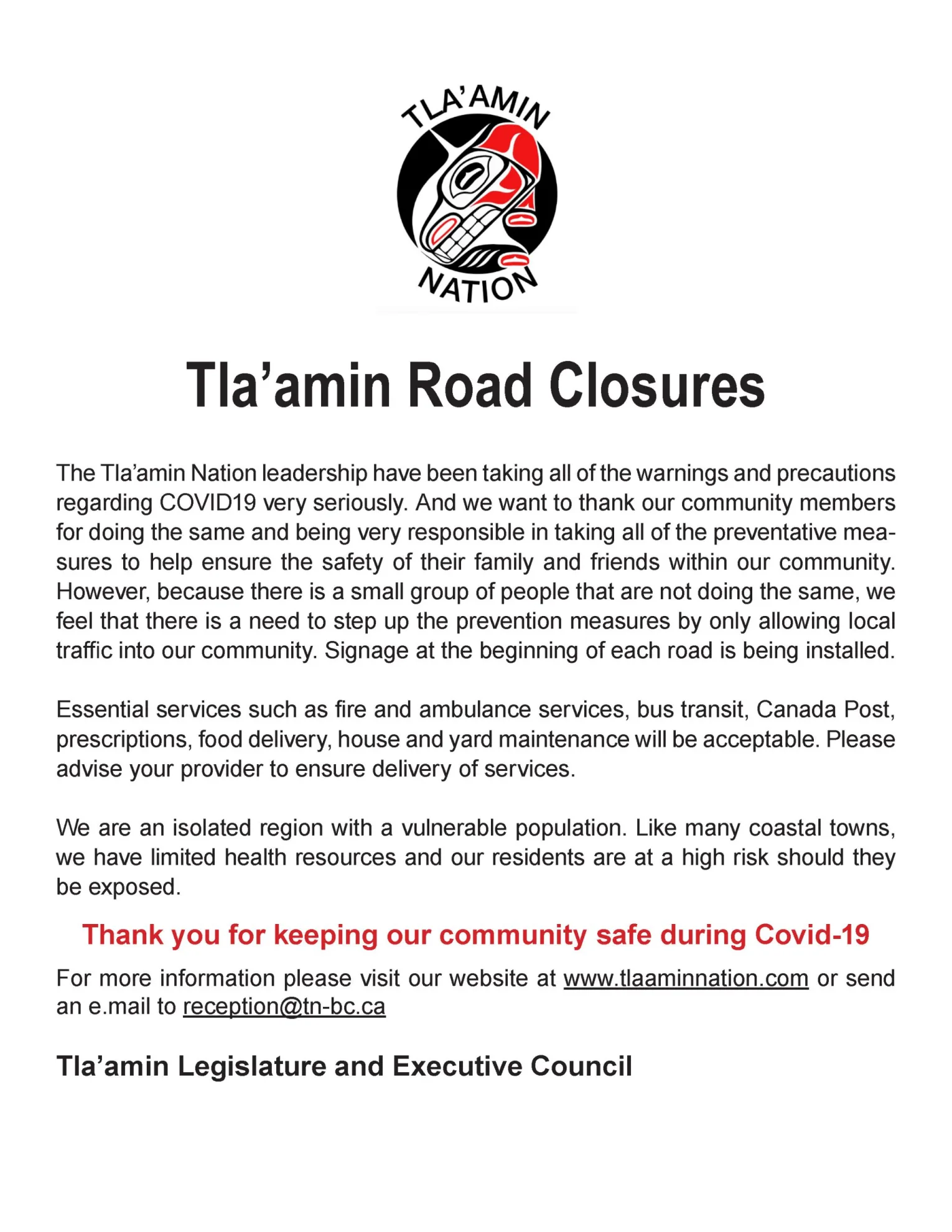The Tla’amin Nation leadership have been taking all of the warnings and precautions regarding COVID19 very seriously. And we want to thank our community members for doing the same and being very responsible in taking all of the preventative measures to help ensure the safety of their family and friends within our community. However, because there is a small group of people that are not doing the same, we feel that there is a need to step up the prevention measures by only allowing local traffic into our community. Signage at the beginning of each road is being installed.