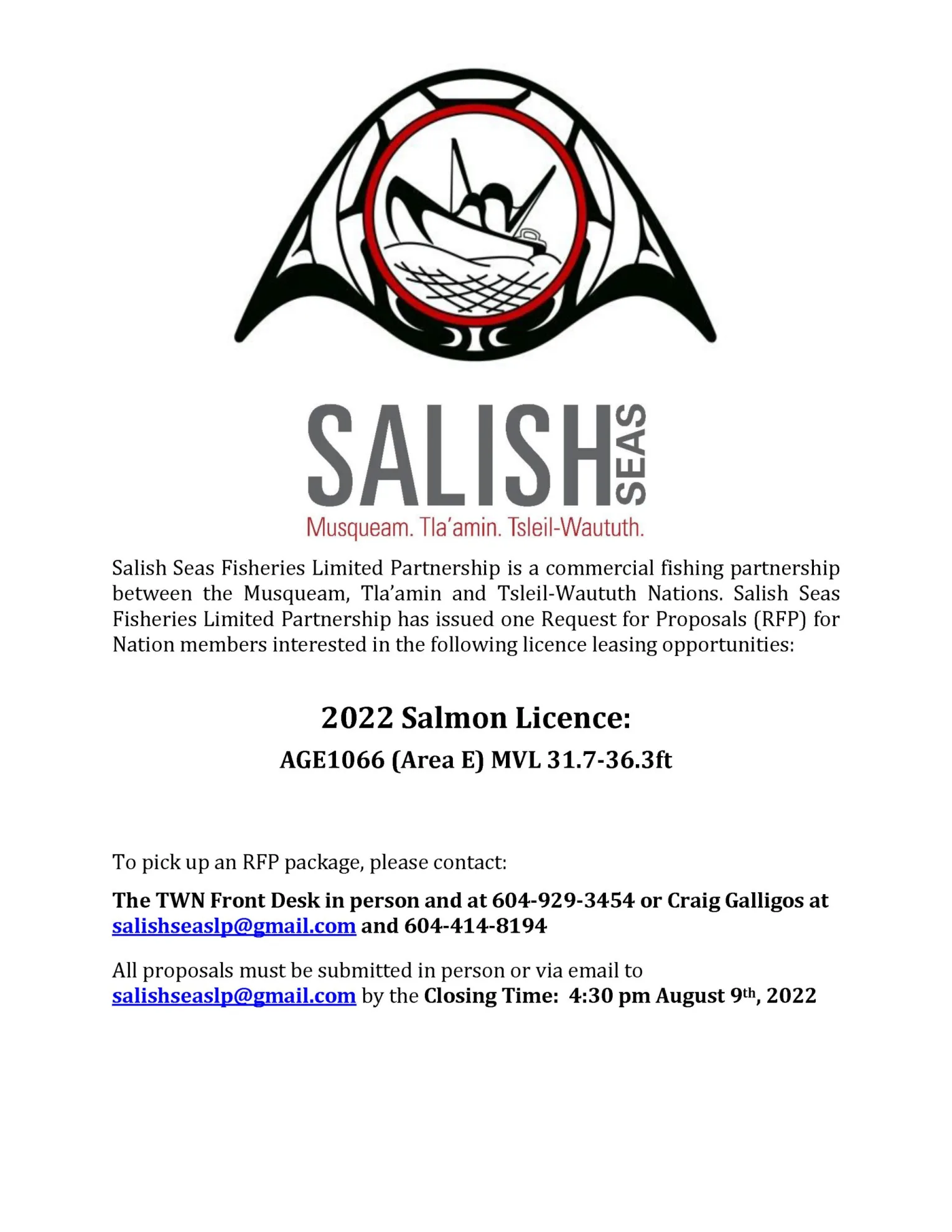 Salish Seas Fisheries Limited Partnership is a commercial fishing partnership between the Musqueam, Tla’amin and Tsleil-Waututh Nations. Salish Seas Fisheries Limited Partnership has issued one Request for Proposals (RFP) for Nation members interested in the following licence leasing opportunities: