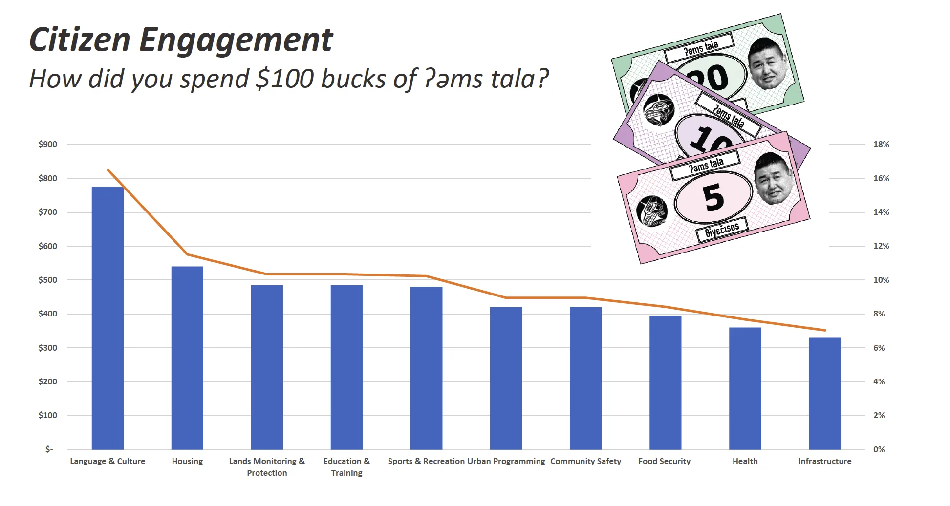 The 2026 $71 million budget forecasts a $5.6m planned deficit. Increased spending comes from $7.5m for tiskwat housing project, $2.8m for sewage connection to the city, $500k for a subdivision feasibility study, $380k for urban, rural and northern housing initiatives, $250k to support program and services at Ɂəms ʔayɛ, $200k to replace an outdated finance system, $165k in additional housing and building insurance costs.