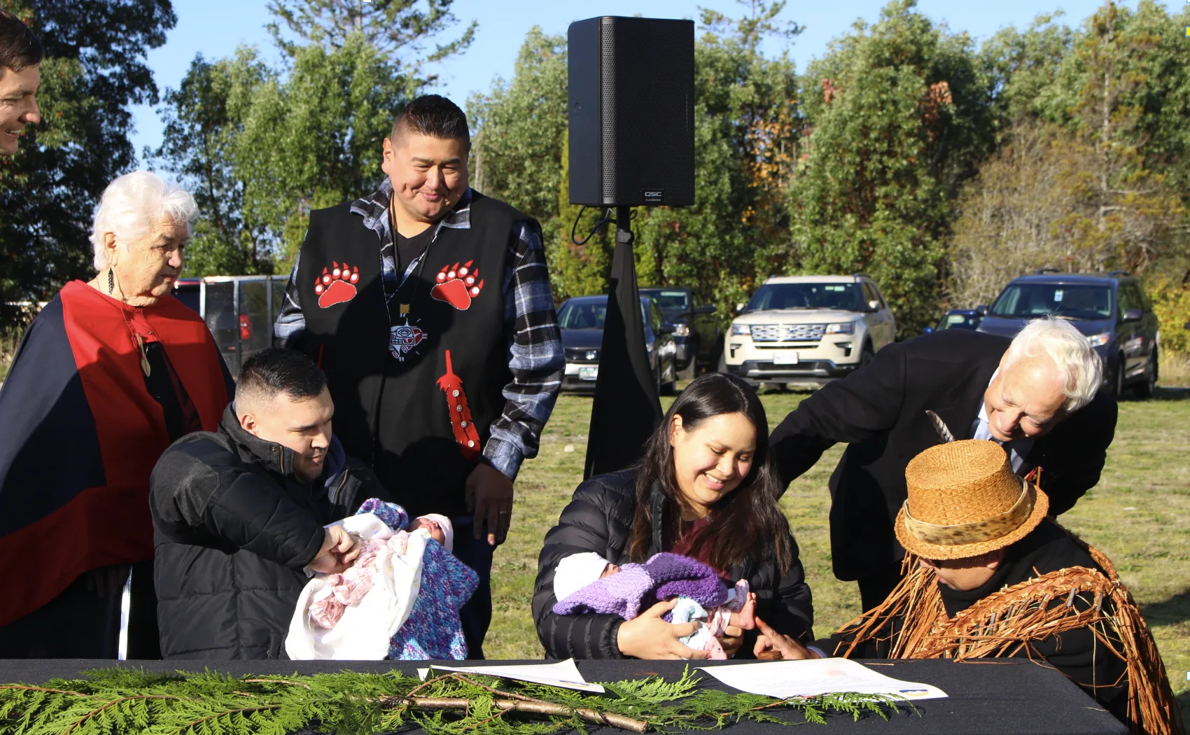 Following speeches by dignitaries, the MOU was signed by hegus Hackett and Premier Eby and witnessed by the youngest and eldest members of Tla’amin to symbolize the destructive legacy and the generational opportunity these two governments recognize at tiskwat.
