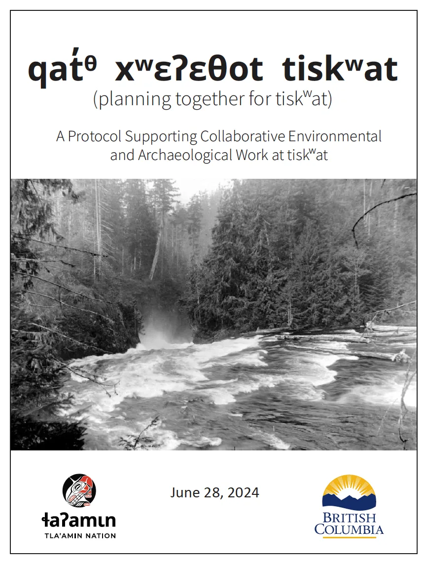 The qat̓ᶿ xʷɛʔɛθot tiskʷat (planning together for tiskʷatt) protocol builds upon this MOU to care for recent archaeological discoveries at the mill site. The Protocol details how the two governments will collaborate on environmental and heritage protection processes and decision-making at the tiskʷat mill site.