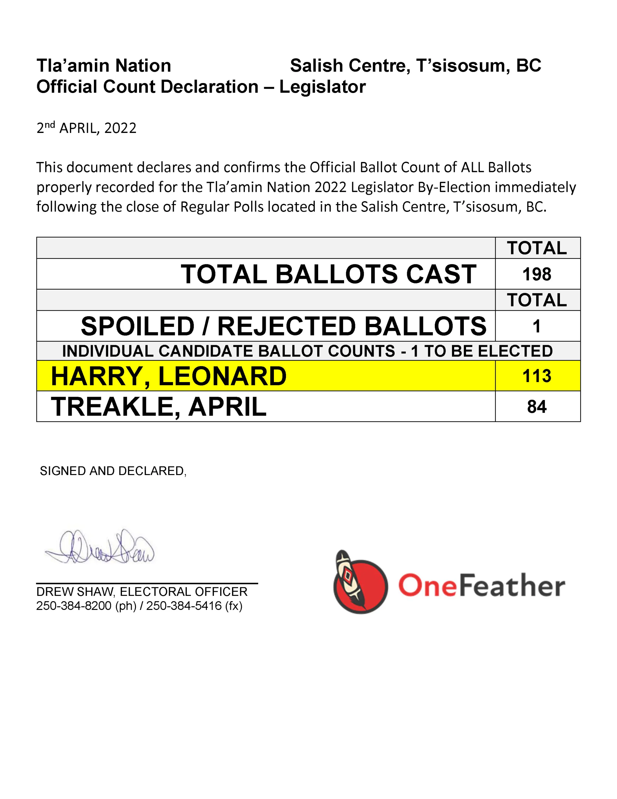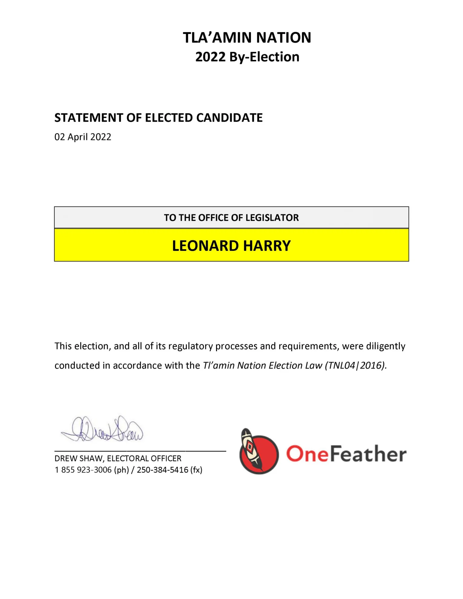 conducted in accordance with the Tl’amin Nation Election Law (TNL04|2016).