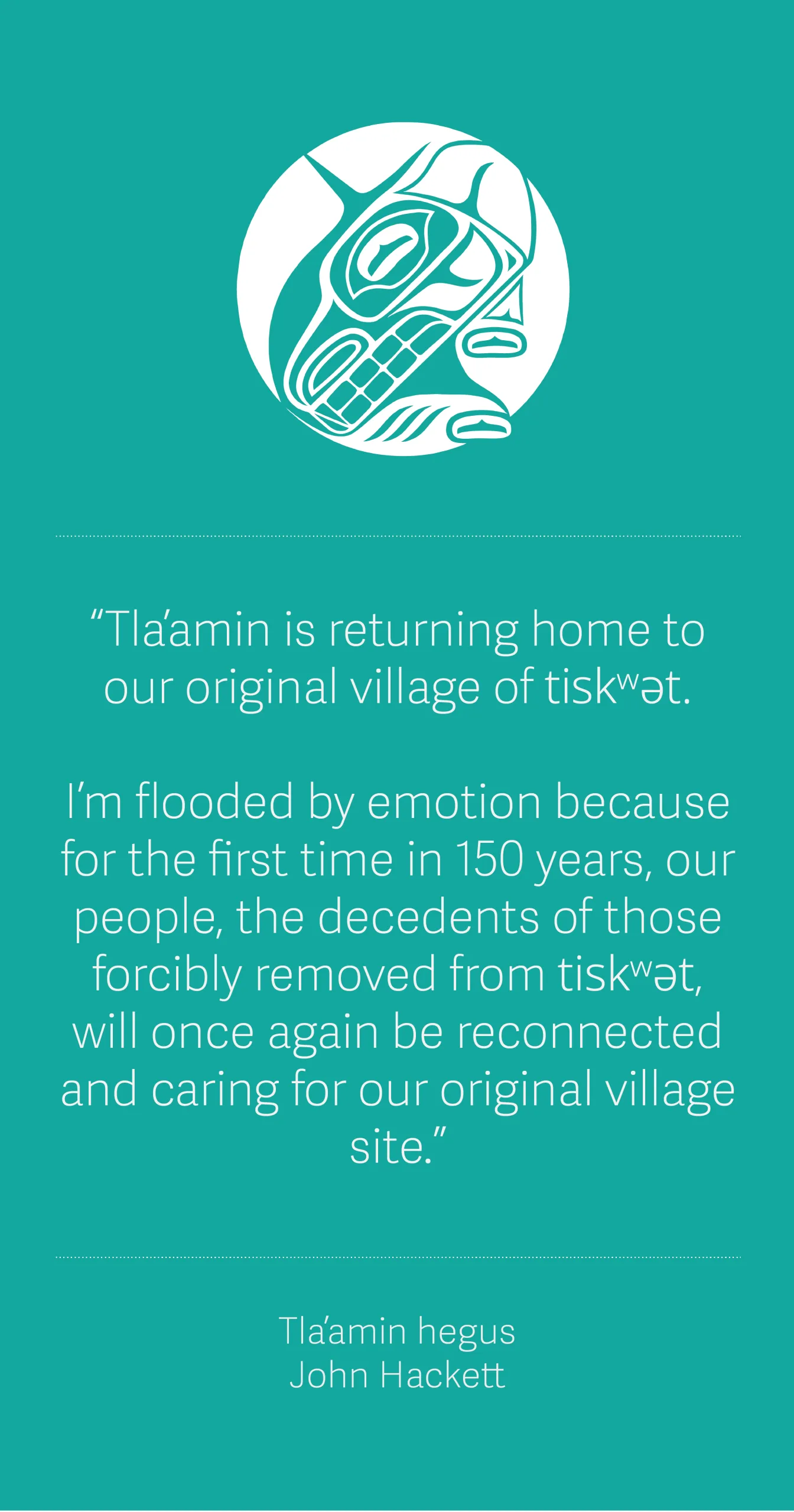 “Tla’amin is returning home to our original village of tiskʷət” said Hegus John Hackett. “I’m flooded by emotion because for the first time in 150 years, our people, the descendants of those forcibly removed from tiskʷət, will once again be reconnected and caring for our original village site.”