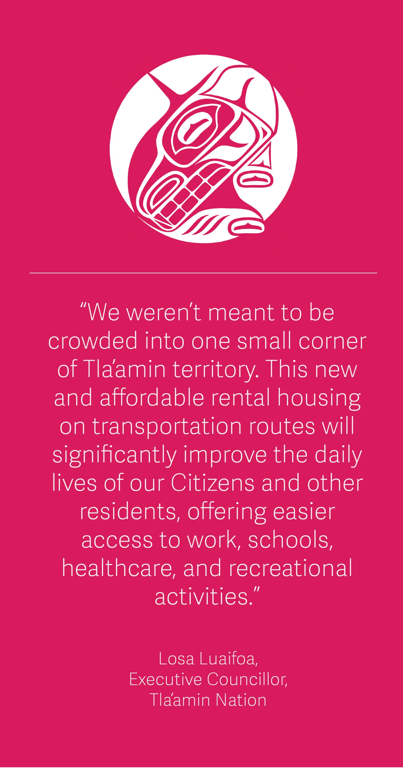 Executive Councillor for Public Works and Capital Infrastructure Losa Luaifoa says, “We weren’t meant to be crowded into one small corner of Tla’amin territory. This new and affordable rental housing on transportation routes will significantly improve the daily lives of our Citizens and other residents, offering easier access to work, schools, healthcare, and recreational activities.”