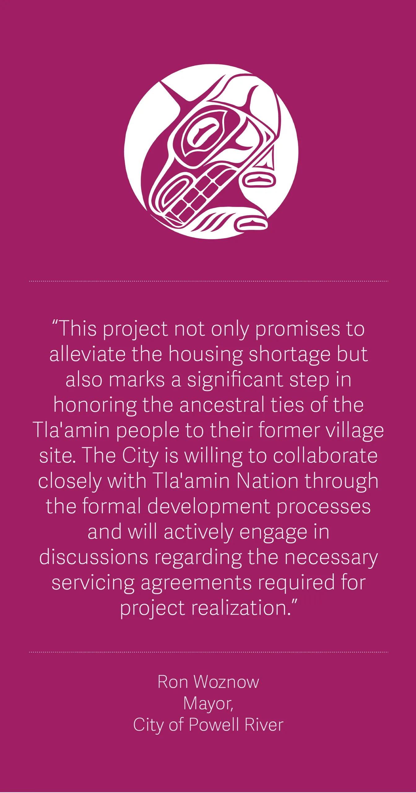 “This project not only promises to alleviate the housing shortage but also marks a significant step in honoring the ancestral ties of the Tla’amin people to their former village site. The City is willing to collaborate closely with Tla’amin Nation through the formal development processes and will actively engage in discussions regarding the necessary servicing agreements required for project realization.” – Mayor Ron Woznow, City of Powell River
