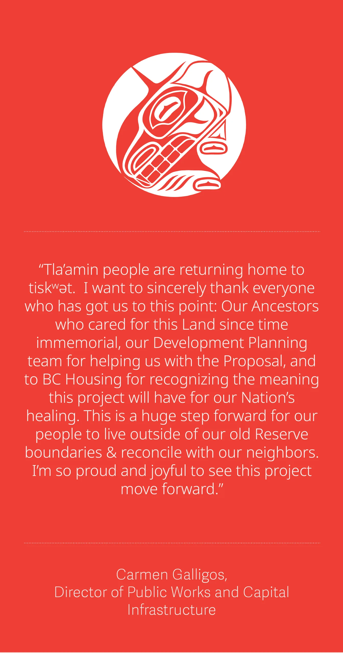 “Tla’amin people are returning home to tiskʷət. I want to sincerely thank everyone who has got us to this point: Our Ancestors who cared for this Land since time immemorial, our Development Planning team for helping us with the Proposal, and to BC Housing for recognizing the meaning this project will have for our Nation’s healing. This is a huge step forward for our people to live outside of our old Reserve boundaries & reconcile with our neighbors. I’m so proud and joyful to see this project move forward.” – Carmen Galligos, Director of Public Works and Capital Infrastructure