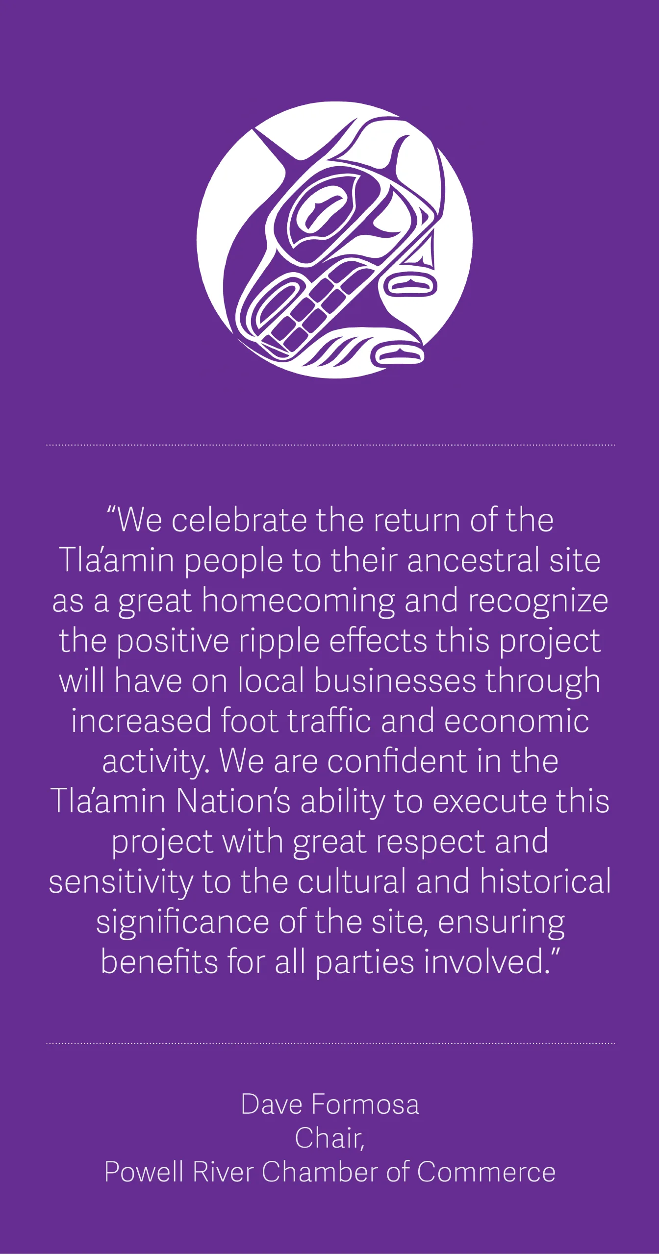 “We celebrate the return of the Tla’amin people to their ancestral site as a great homecoming and recognize the positive ripple effects this project will have on local businesses through increased foot traffic and economic activity. We are confident in the Tla’amin Nation’s ability to execute this project with great respect and sensitivity to the cultural and historical significance of the site, ensuring benefits for all parties involved.” – Dave Formosa, Chair, Powell River Chamber of Commerce