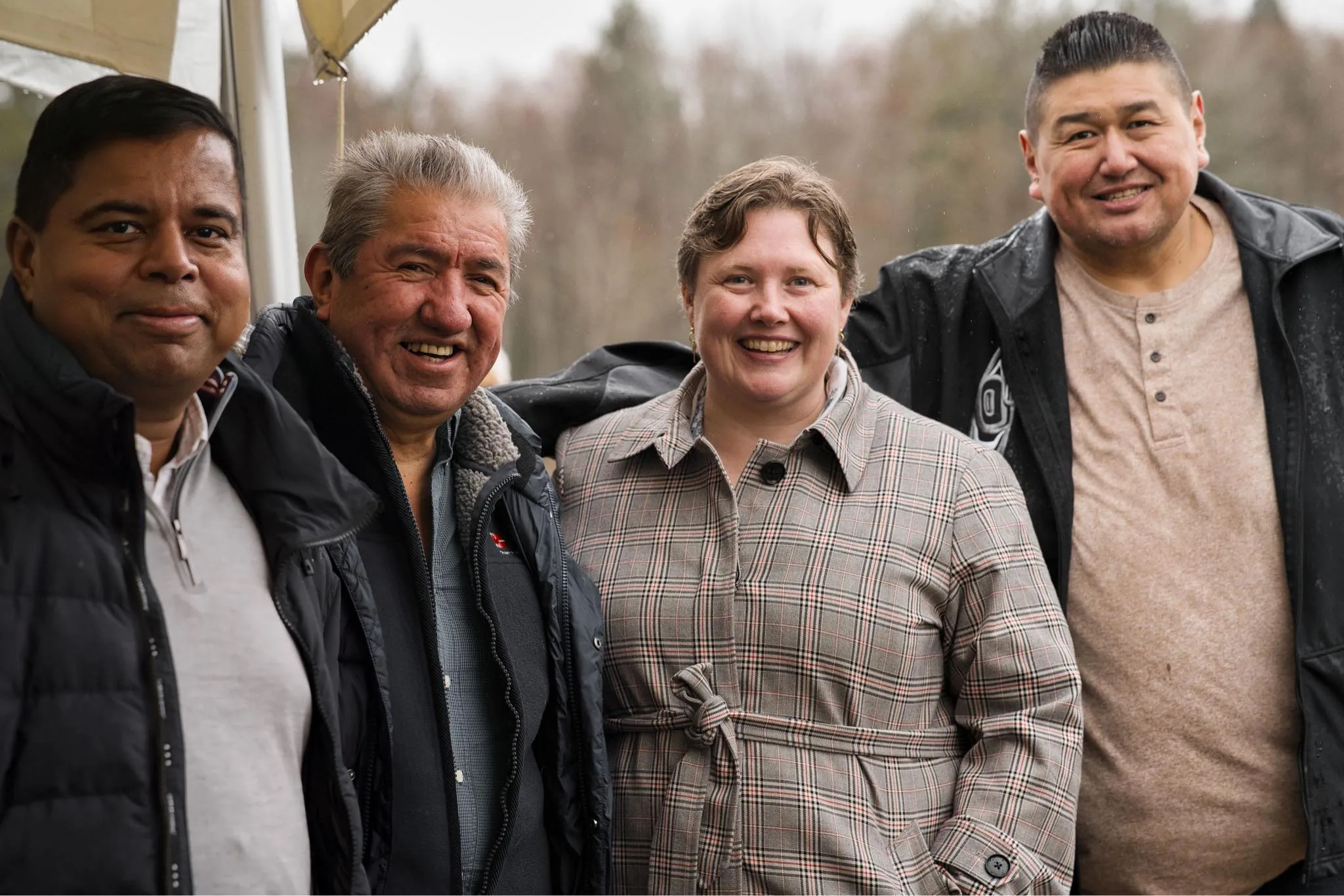 Federal Minister of Crown and Indigenous Relations Gary Anandasangaree, Homalco Chief Darren Blaney, Member of Parliament North Island, Powell River, Rachel Blaney and Hegus John Hackett share a moment during the ground blessing ceremony. [photo Manu Luaifoa]