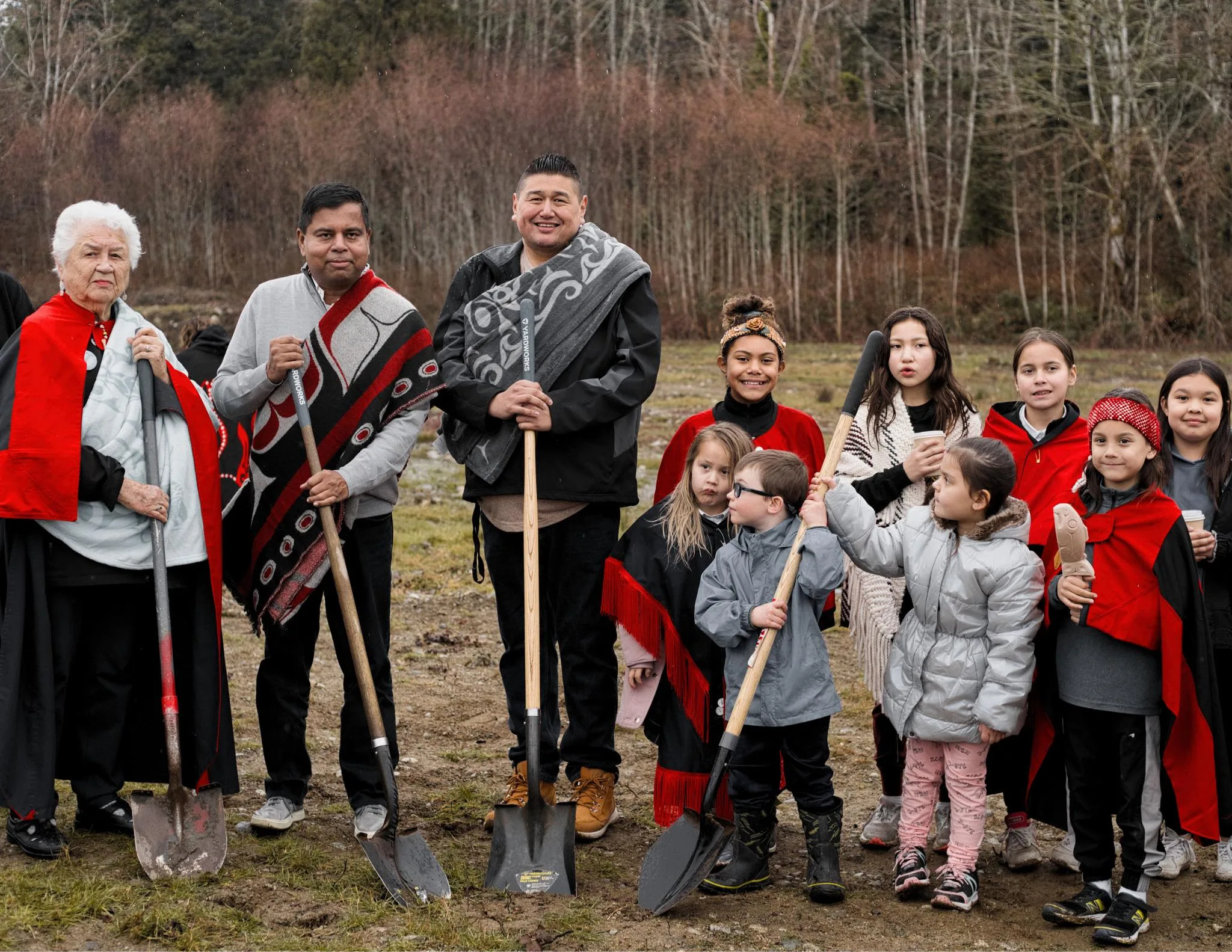 Elder Elsie Paul, Minister of Crown Indigenous Relations Gary Anandasangaree, Hegus John Hackett break ground as Tla’amin children look on. [photo Manu Luaifoa]