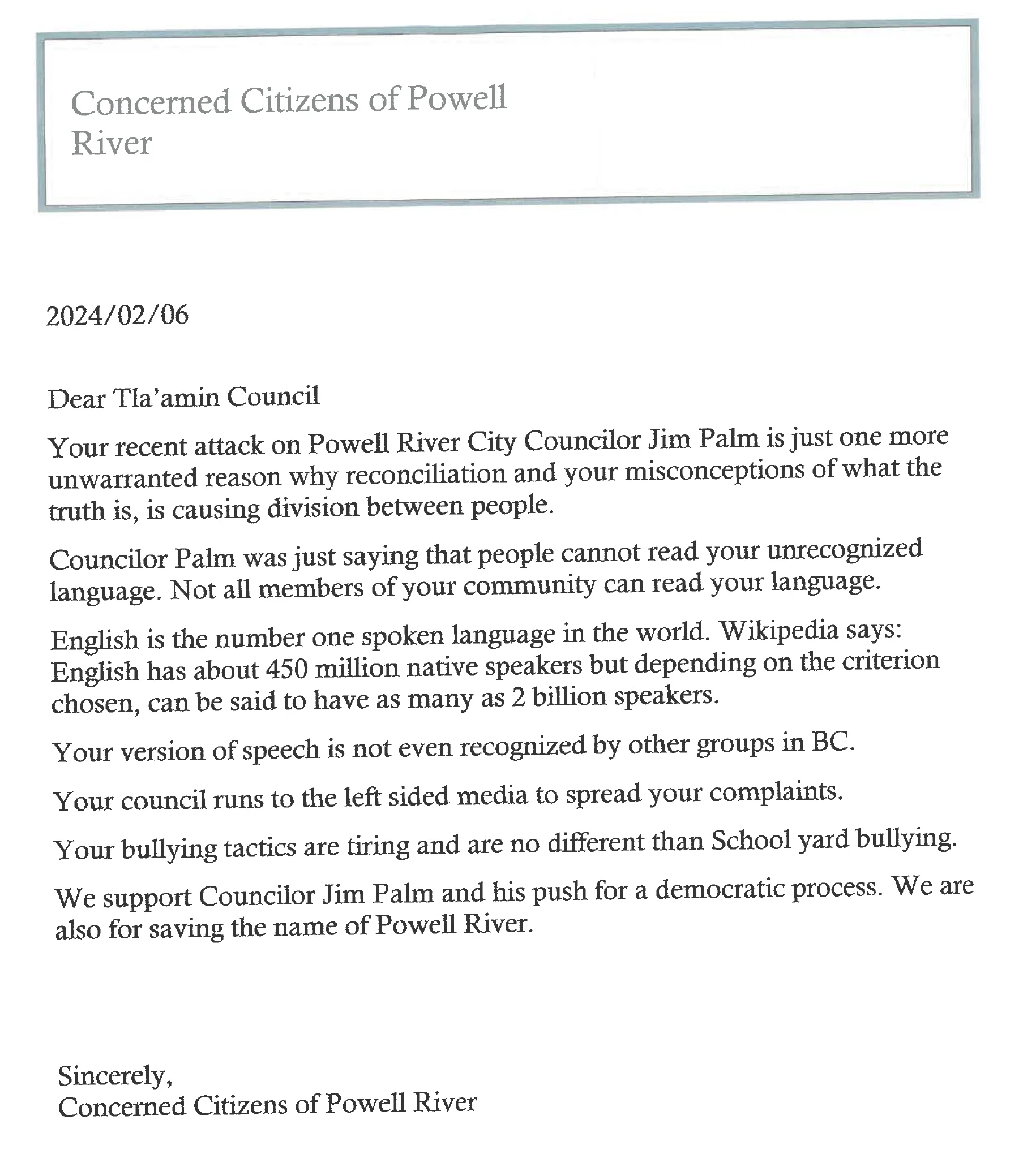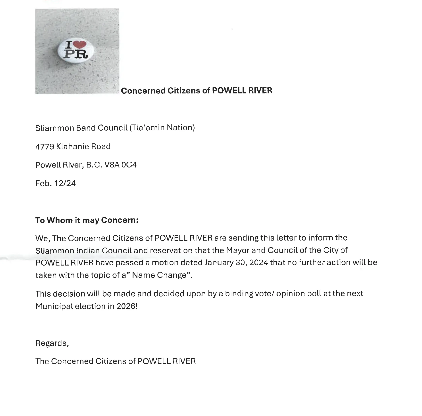 Letter from Concerned Citizens of POWELL RIVER received February 12, 2024