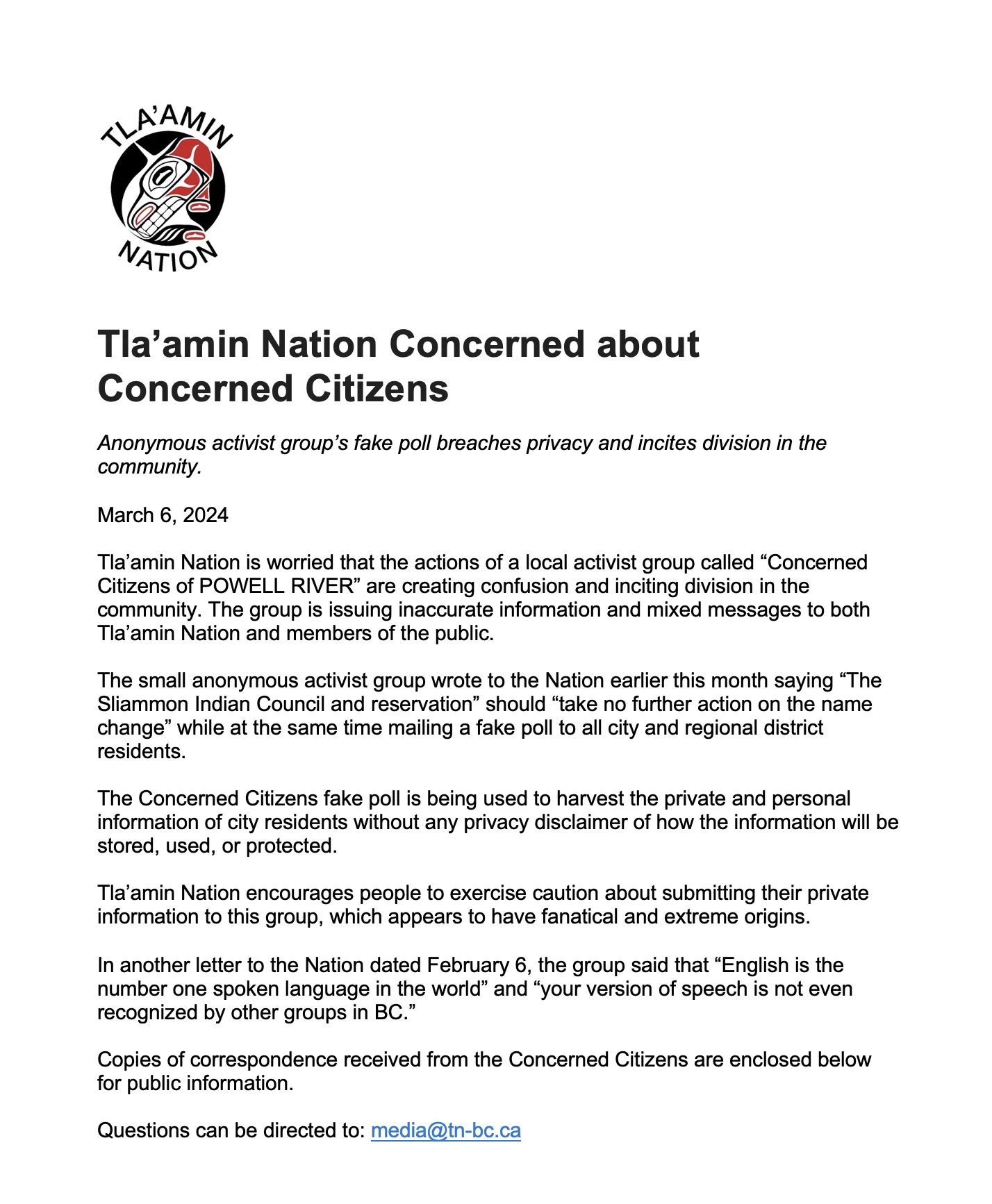 The small anonymous activist group wrote to the Nation earlier this month saying “The Sliammon Indian Council and reservation” should “take no further action on the name change” while at the same time mailing a fake poll to all city and regional district residents.