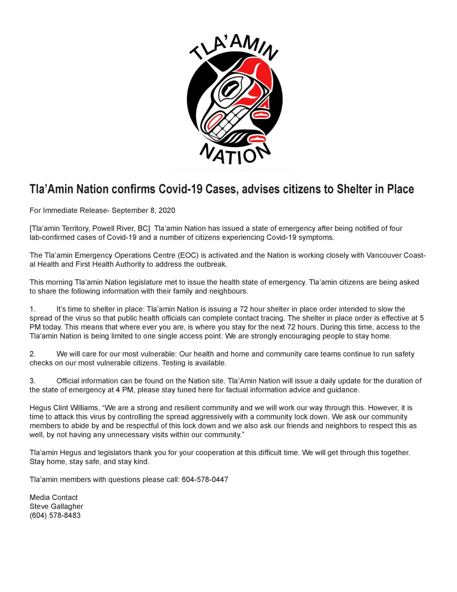 This morning Tla’amin Nation legislature met to issue the health state of emergency. Tla’amin citizens are being asked to share the following information with their family and neighbours.
