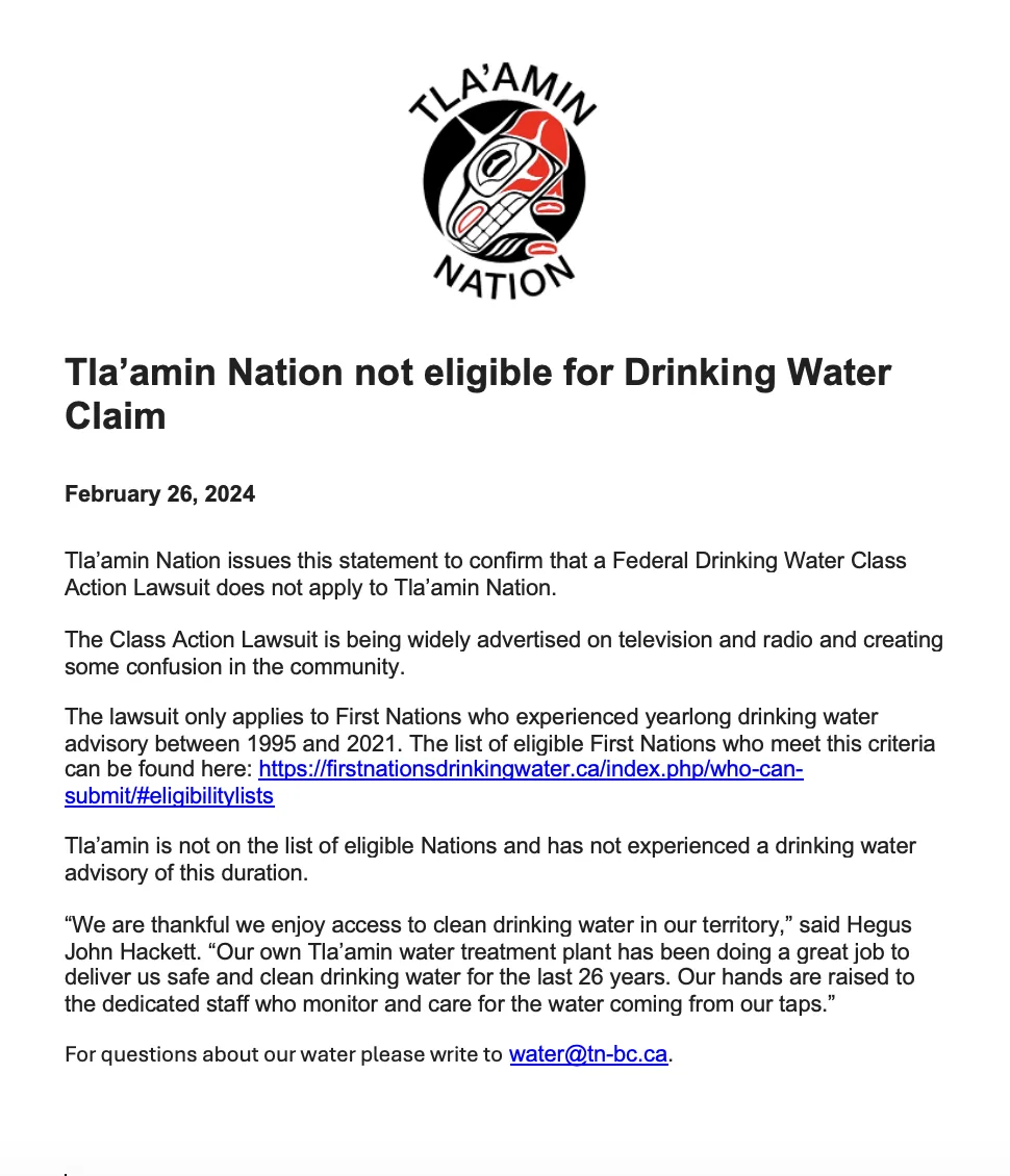 Tla’amin Nation issues this statement to confirm that a Federal Drinking Water Class Action Lawsuit does not apply to Tla’amin Nation.