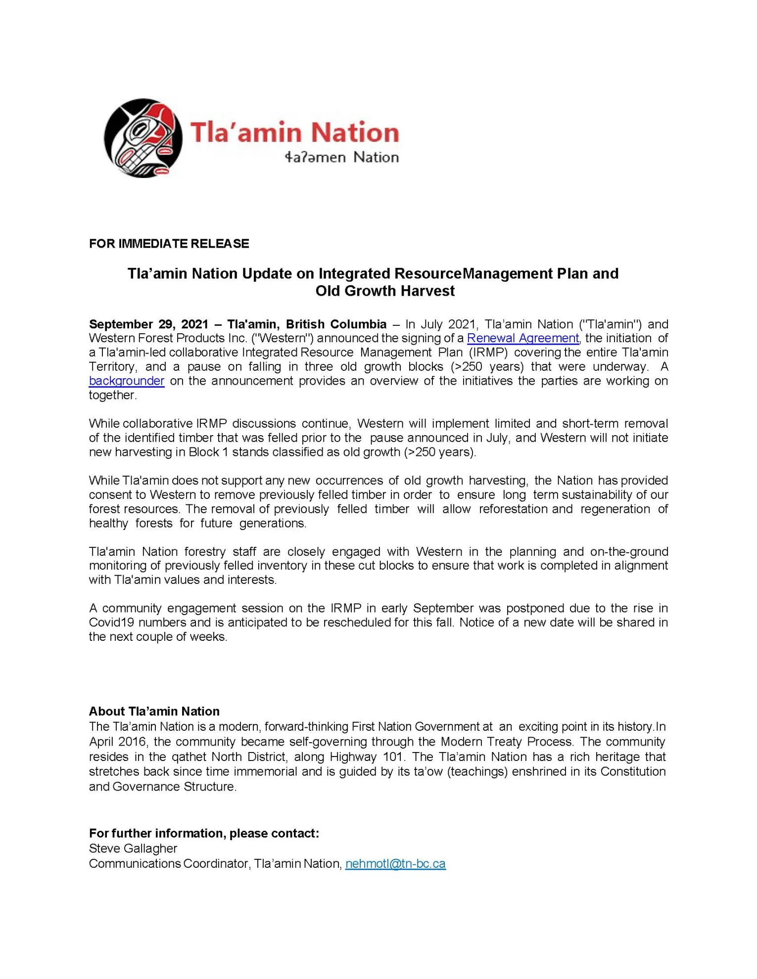 September 29, 2021 – Tla’amin, British Columbia – In July 2021, Tla’amin Nation (“Tla’amin”) and Western Forest Products Inc. (“Western”) announced the signing of a Renewal Agreement, the initiation of a Tla’amin-led collaborative Integrated Resource Management Plan (IRMP) covering the entire Tla’amin Territory, and a pause on falling in three old growth blocks (>250 years) that were underway. A backgrounder on the announcement provides an overview of the initiatives the parties are working on together.